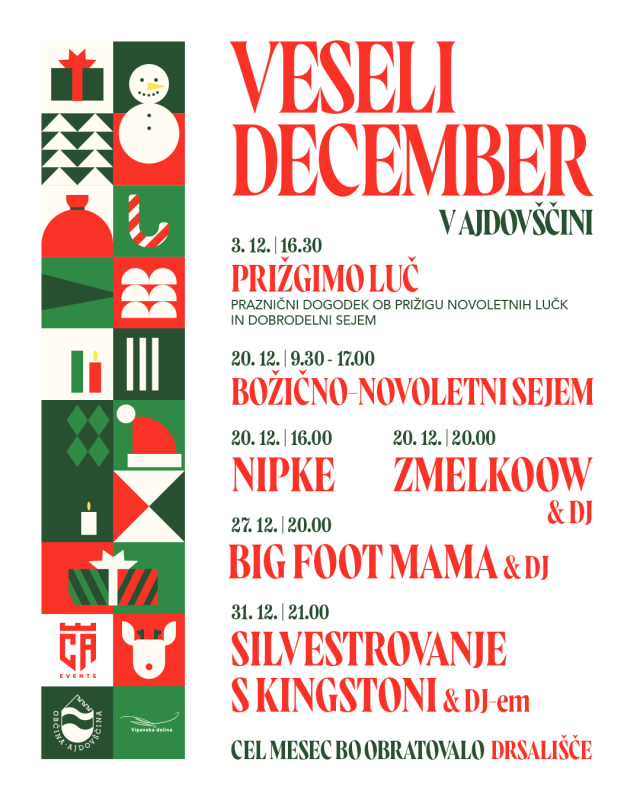 Veseli december se v Ajdovščini začenja 3. decembra s prižigom novoletnih lučk in dobrodelnim sejmom. Čez celoten mesec se bodo nato vrstili številni različni dogodki, ki jih pripravljajo domača društva in drugi organizatorji.